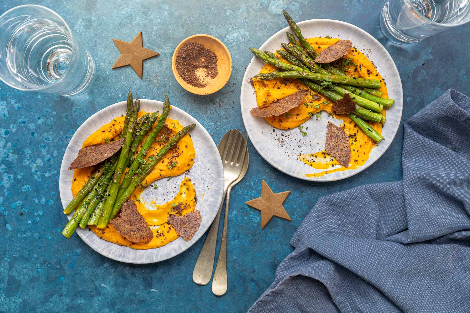 Op zoek naar een uniek én makkelijk Kerst voorgerecht? Probeer eens deze asperges met een frisse wortel-gemberspread. Afgewerkt met een krokante tuile van sumac brengt dit gerecht niet alleen kleur, maar ook een vrolijke kerstsfeer op je bord! En het mooiste: dit Kerst voorgerecht is helemaal vegetarisch, dus iedereen aan tafel kan ervan genieten!