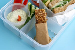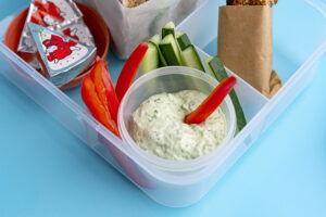 Tijn maak je altijd blij met een lekkere sandwich, dus zit er een kaassandwich in deze lunchbox van onze jongste Eatertainer. Daarbij gaat een lekkere groente muffin, granolareep, groentesticks met dip en vrolijke snackkaasjes. Een lekkere en gevarieerde lunchbox!