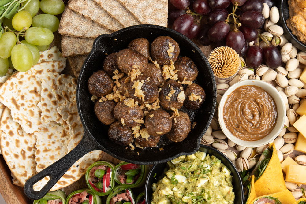 Bij het vullen van de plank begin je met de grotere gerechtjes. Vul de gaten tussen de gerechtjes op met de overige snacks. Vergeet ook de prikkers niet!