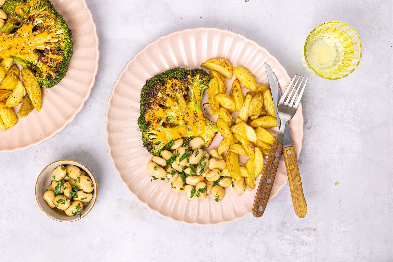 Broccolisteak met aardappelpartjes en limabonen