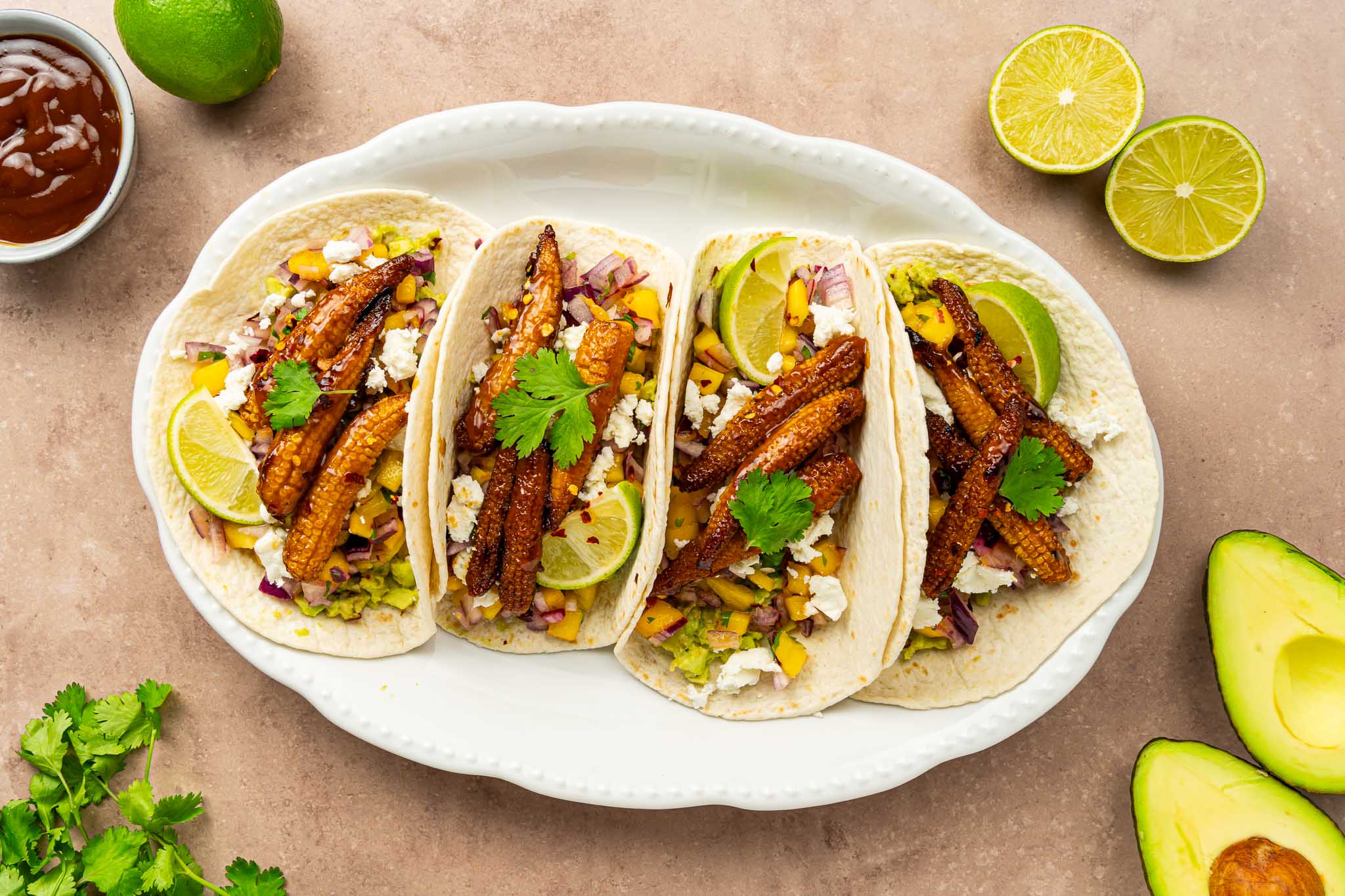 Deze baby corn taco’s combineren geroosterde maïs met frisse salsa en romige avocado. De baby corn krijgt in de oven een licht gekaramelliseerde buitenkant en een zachte, sticky structuur door de BBQ saus. In combinatie met zoete mango, frisse limoen en kruidige koriander ontstaat een gerecht dat zowel fris als rokerig is. Een plantaardige taco met duidelijke contrasten in smaak en textuur.