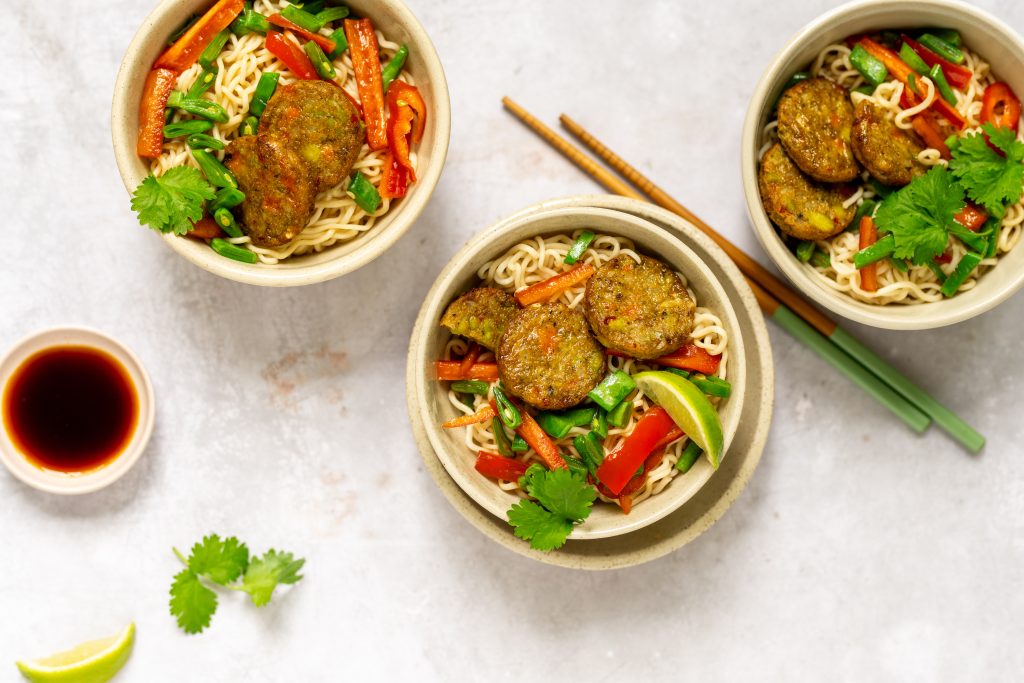 Met de Vivera Thai protein bites zet je in een handomdraai een smakelijke, vegetarische maaltijd op tafel! De Thai protein bites zijn rijk aan eiwitten en vezels én bevatten veel groenten. Wat wil je nog meer? Combineer ze zoals in dit recept met noedels met lekker veel groenten en smaakmakers als limoen en sojasaus!