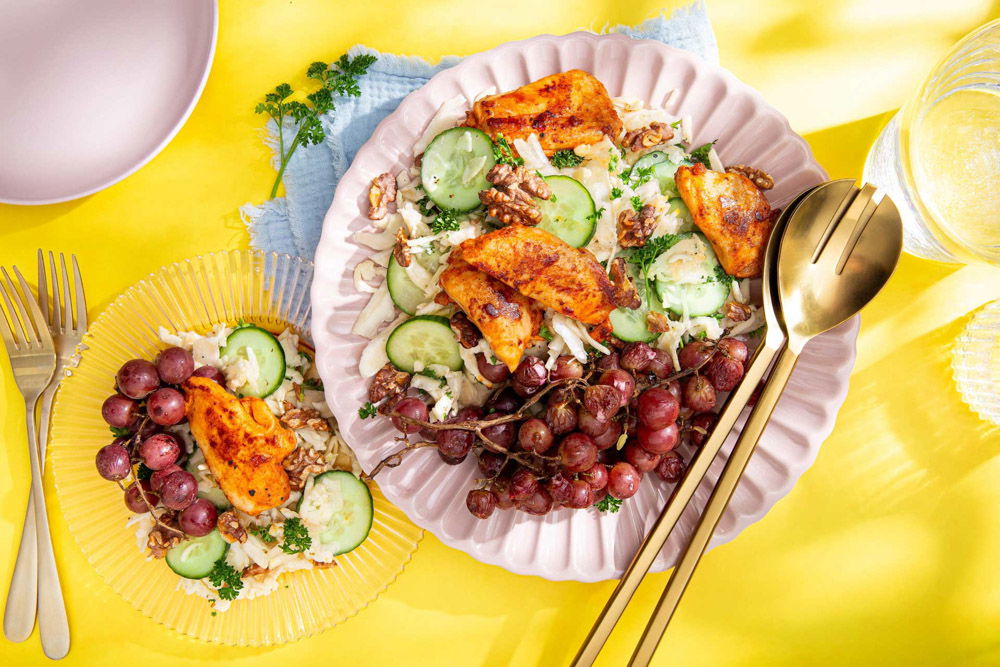 Toe aan een voedzame maaltijd waarbij je zowel hartige als zoete smaken proeft? Zoek niet verder, probeer deze witte koolsalade met druiven! De knapperige witte kool mengen we met slausaus, frisse komkommer en peterselie, terwijl de walnoten en druiven in de oven worden geroosterd. Maak de salade compleet met gemarineerde kippendij.