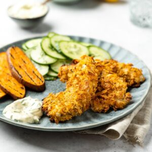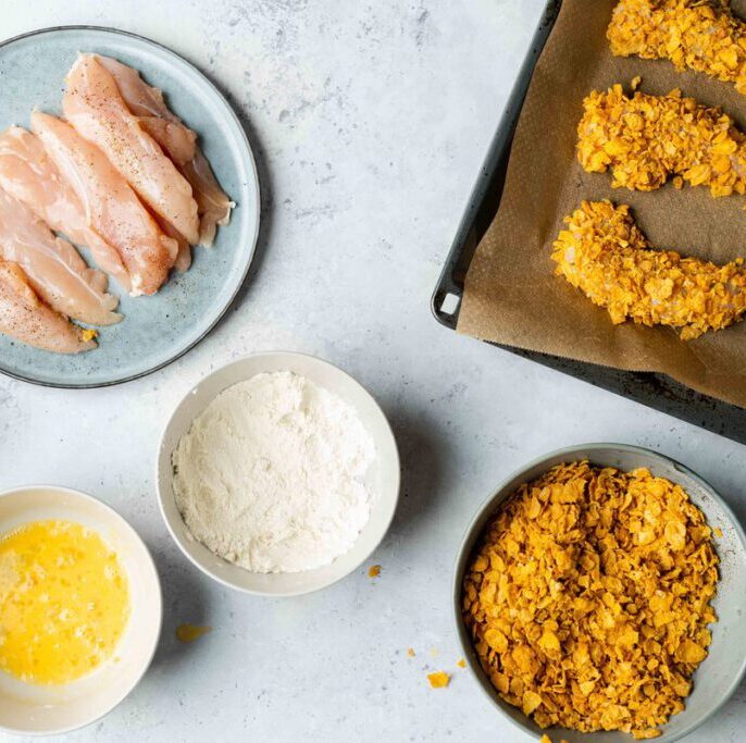 Maak zelf deze heerlijke krokante kip met cornflakes. In plaats van deze te frituren, bereid je de kip in de oven. Samen met gegrilde zoete aardappel, een frisse komkommersalade en een zelfgemaakte knoflooksaus zet je een lekkere maaltijd op tafel.