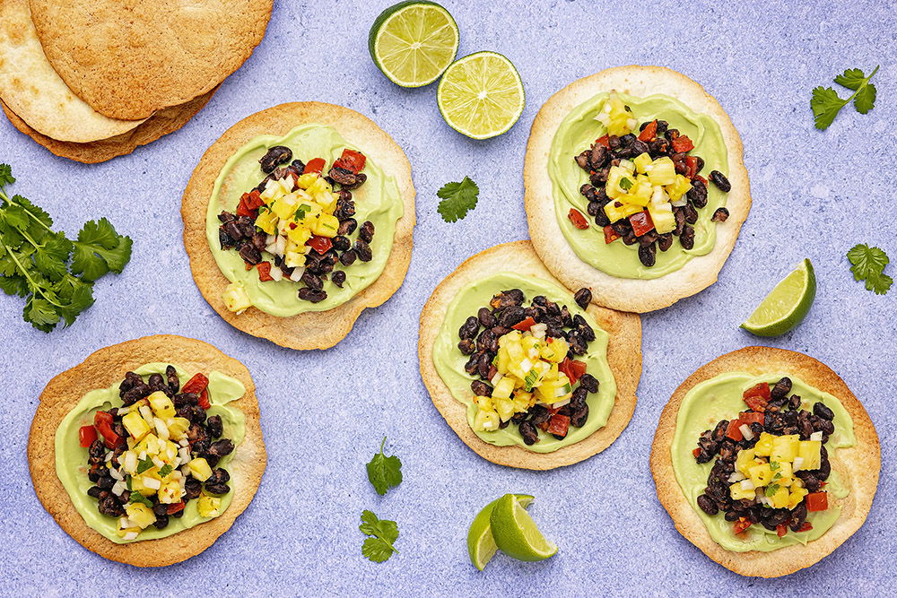 Kies vanavond voor Mexicaans met deze vegetarische tostada’s! Tostada’s zijn heerlijke, krokant gebakken tortillawraps, meestal gefrituurd, en worden belegd met diverse toppings. Het is een echt Mexicaans streetfood gerecht en je komt het dan ook overal tegen in Mexico! In dit recept gaan we voor tostada’s met avocado, zure room, zwarte bonen én ananas.