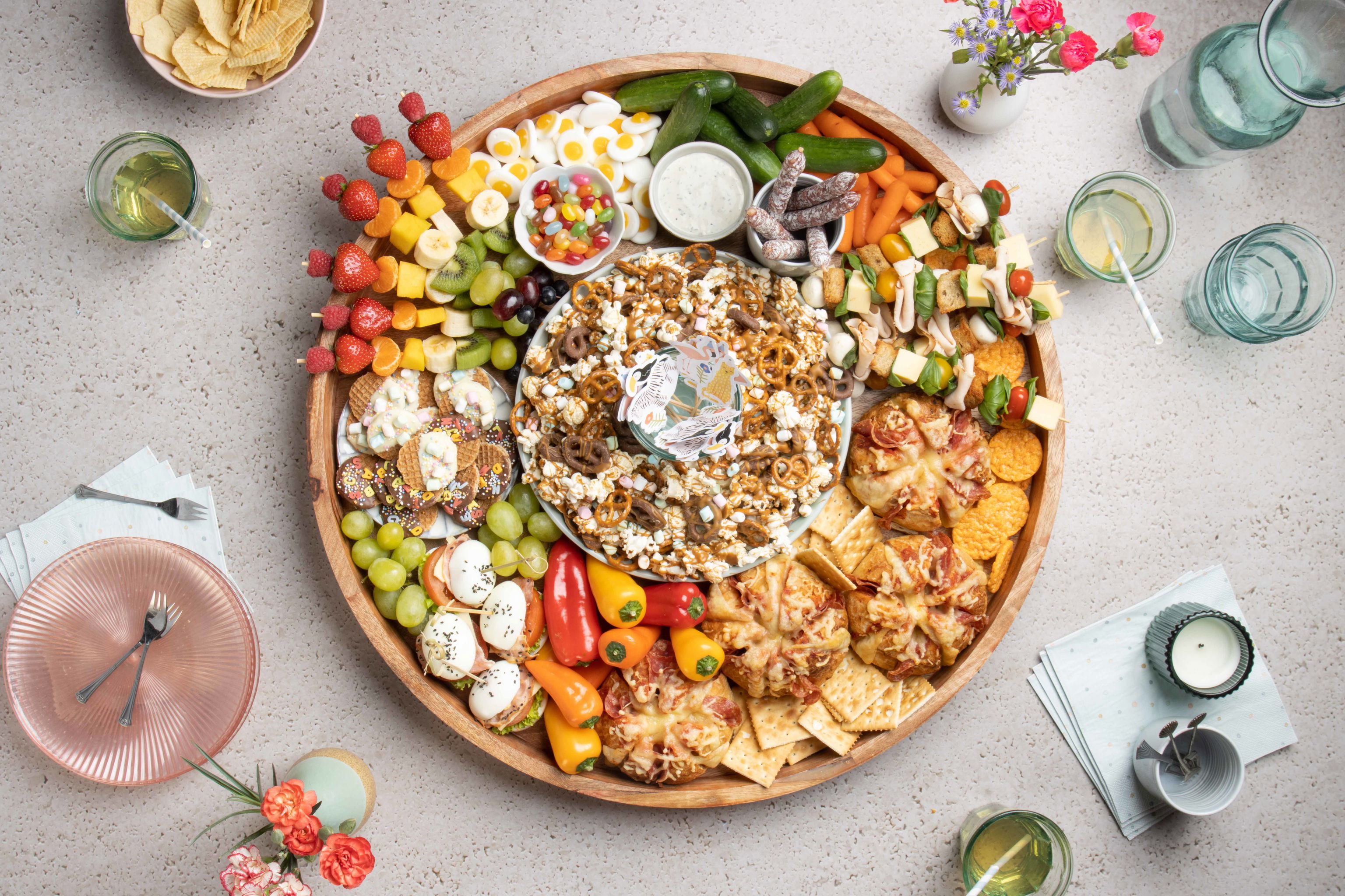 Eatertainer Tijn heeft speciaal voor de kinderen een echte kids snackplank gemaakt! De snackplank is gevuld met allerlei recepten die geschikt zijn om met óf door kinderen te (laten) maken. Een goedgevulde plank die gegarandeerd bij iedereen in de smaakt valt en heerlijk is voor een filmavond of een picknick in het park!