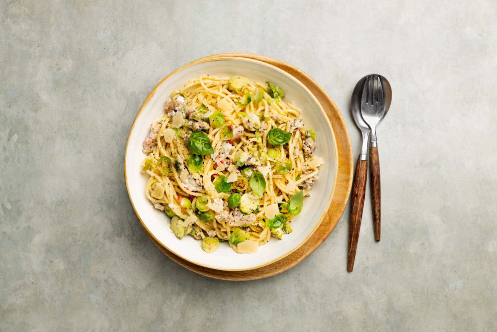 Een pastasoort die bij iedereen in de smaak valt, is spaghetti. Met deze pasta kan je eindeloos variëren. In dit recept toveren we de spaghetti op tafel met kip en spruitjes, maken we het romig door crème fraîche toe te voegen en garneren we het geheel met Parmigiano Reggiano en basilicumblaadjes.