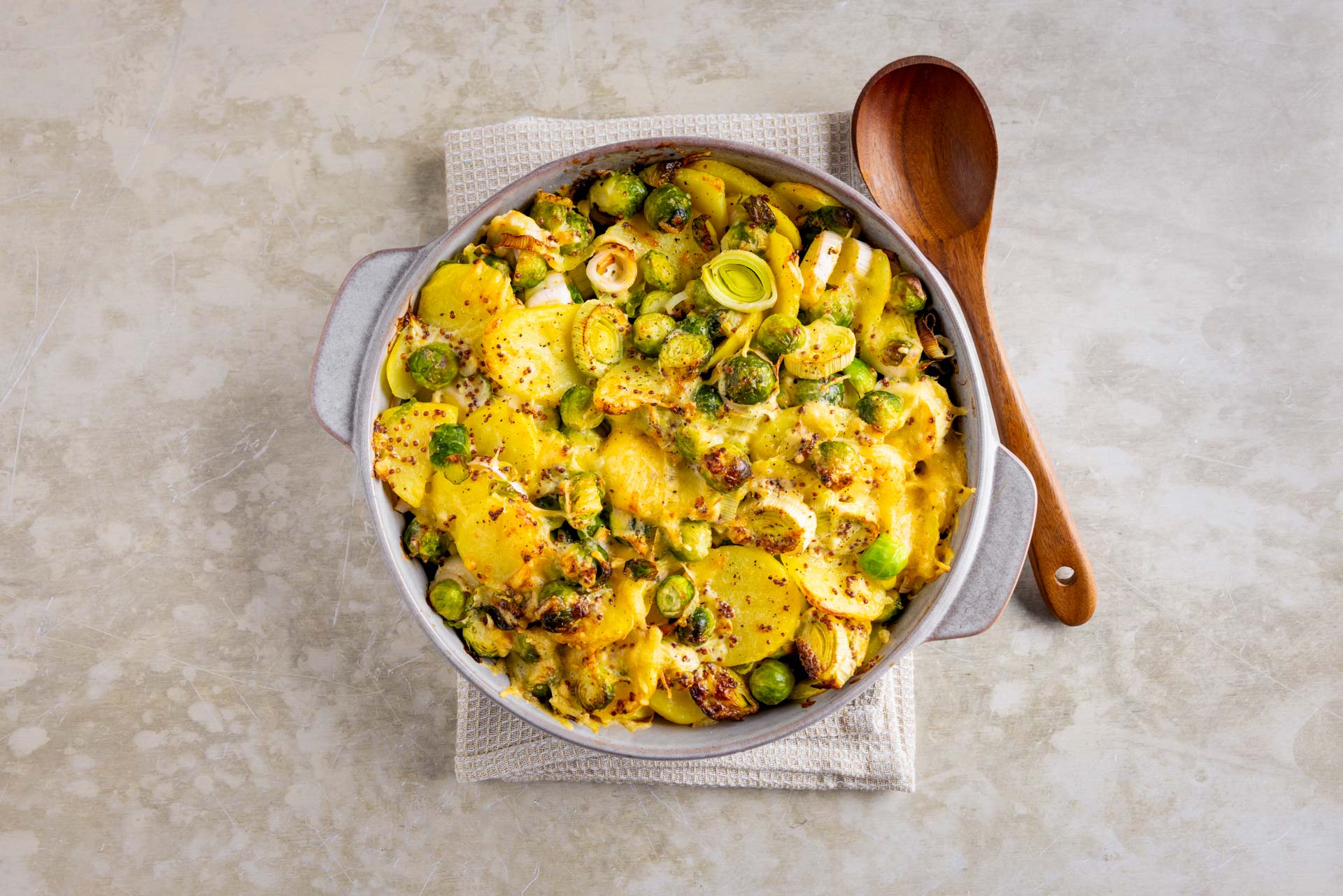 Met dit gerecht lust ineens iedereen spruitjes! Je combineert ze namelijk met prei, knoflook, mosterd, aardappelschijfjes, knoflook en geraspte kaas. Schuif het de oven in en na 30 minuten geniet je van een heerlijke maaltijd!