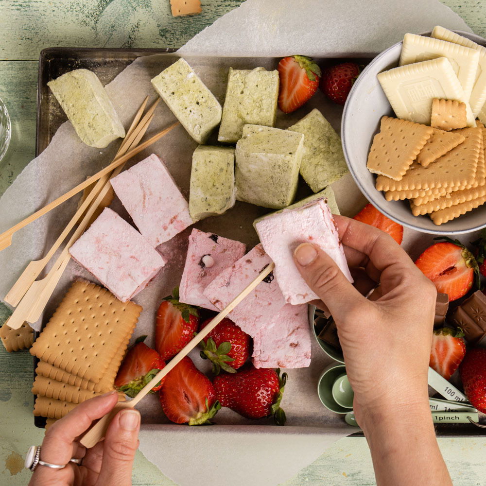 Een avondje bij het kampvuur, muziek op de achtergrond en natuurlijk… marshmallows! Met deze zoete versnapering waan je je meteen in de zomersferen. En het beste van alles: je maakt deze matcha en strawberry cheesecake marshmallows heel eenvoudig zelf. Rooster een marshmallow boven de vuurkorf of de barbecue en eet deze direct op of plet de marshmallow tussen 2 koekjes en een stukje chocola: zo maak je heerlijke s’mores!