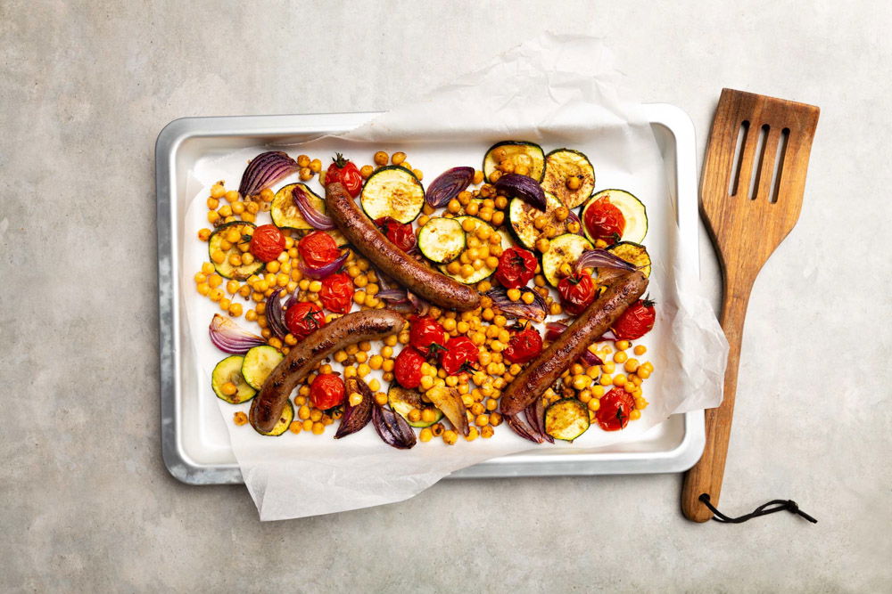 Traybake met broccoli, braadworst en krieltjes