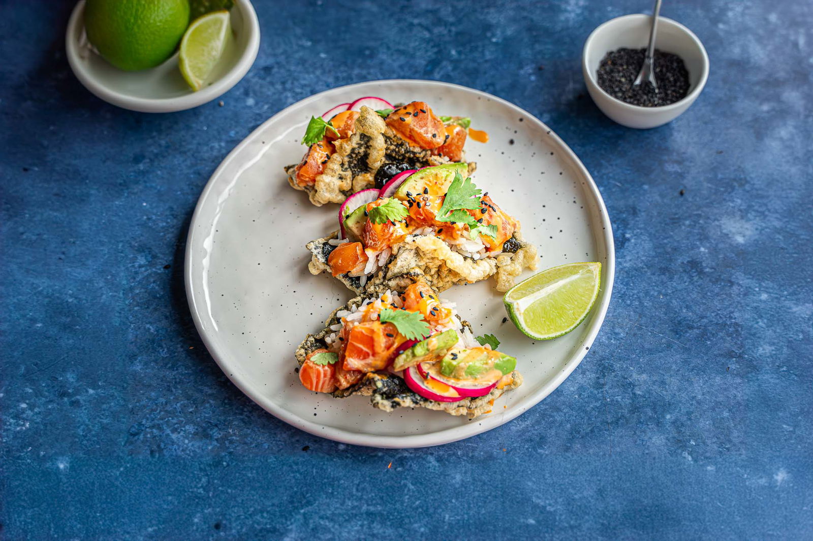 Sushi nacho’s met garnalen en avocado