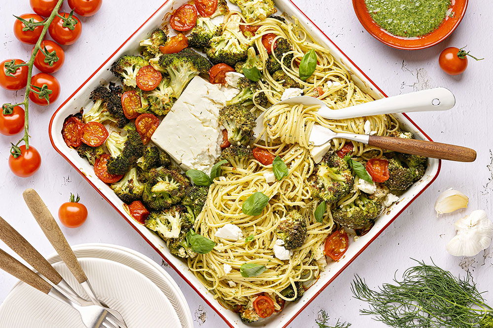Pasta pesto met gebakken feta en broccoli
