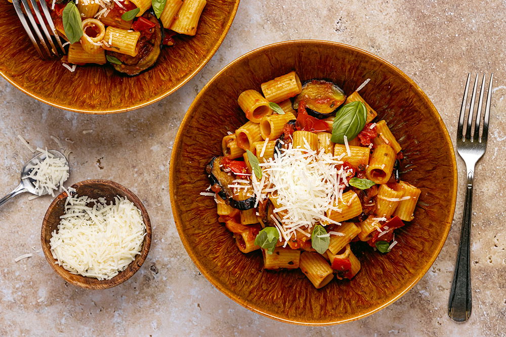 Pasta alla Norma met pijnboompitten en gebakken ricotta
